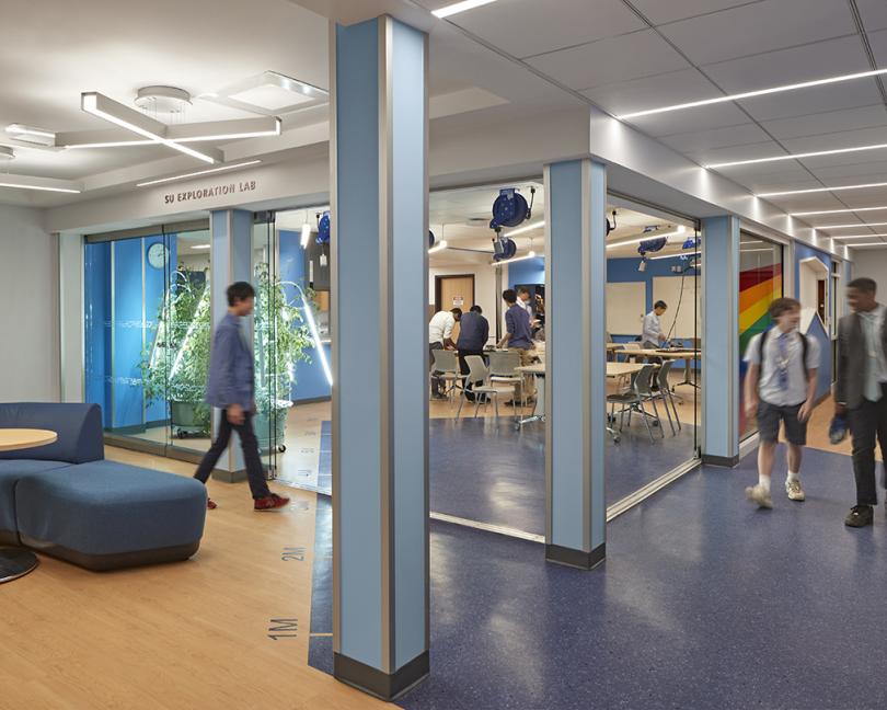Bringing Fessenden students expanded learning environments, the Science Wing features improved technology for flexible learning, adaptable display areas for rotating curriculum, and opportunities for learning designed into the architecture: a functioning prism wall, a living green wall, and age-appropriate teaching topics integrated into floor-finish patterns. A comprehensive renovation, the Science Wing incorporates new finishes, lighting, HVAC system, and the upgrade of plumbing, fire protection, and electrical systems.