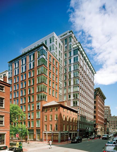Located in the heart of Boston’s financial district, Folio Boston is a block away from the Rose Kennedy Greenway. The building replaces a former parking lot near Rowes Wharf and Faneuil Hall with condominium units and upscale retail spaces that reactivate the dense city streetscape. The design preserves and incorporates a 4,000-square-foot structure designed in 1807 by architect Charles Bulfinch. Residences range from one-bedroom to three-bedroom units. Residents have access to the full range of amenities available through a neighboring hotel, including 24-hour concierge, a health club, and room service.