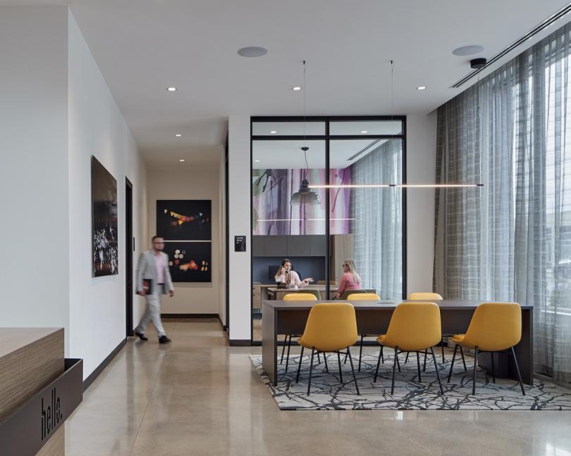The Harvey’s interiors are marked by original artwork sourced from global and local artists, beginning with a stunning two-story lace-inspired backdrop that greets residents and visitors upon arrival. Custom pieces throughout infuse the amenity-rich space with color, vibrant and evocative imagery, and a mix of materials and media in all of the shared spaces.