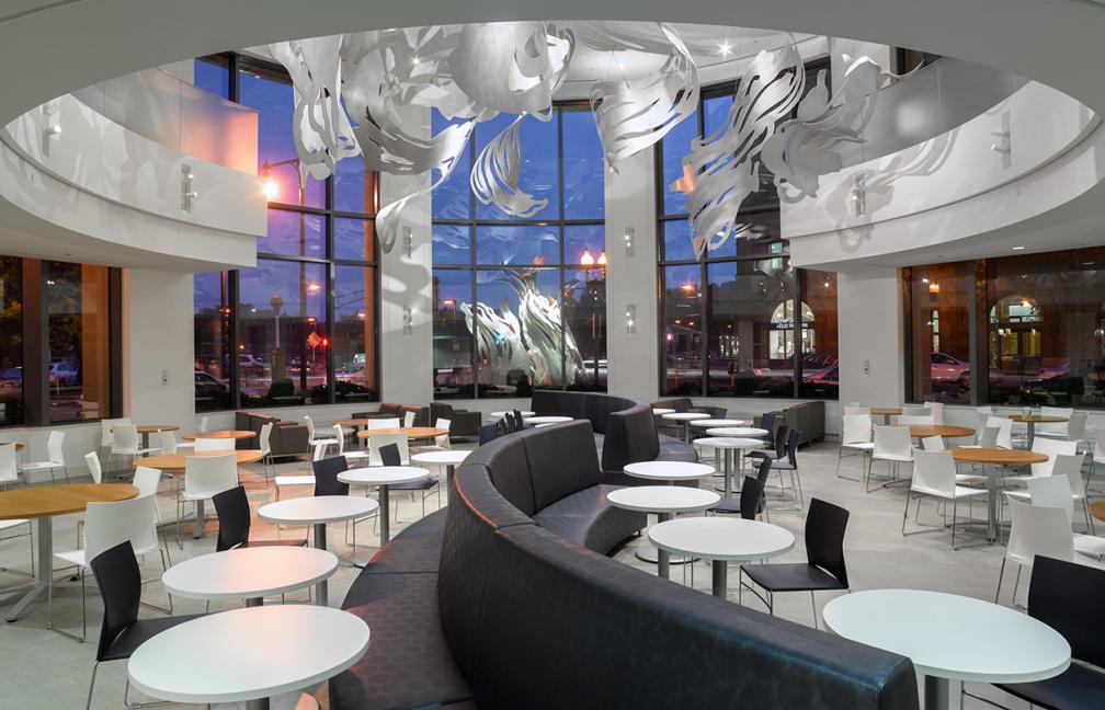 The distinctive triangular shape and curved edges are a direct response to the resolution of the unique challenge of a diagonal street grid. The arched glass foot bridge connecting the new tower with the existing historic Salada Tea Building serves as a visually stimulating and efficient alternative to solving concerns of a closed pedestrian walkway. The cafeteria spans two floors, offering a variety of options and cuisines, seating 700 people and serving 5,000 employees, encouraging the corporate culture of “breaking bread together.” A new, two-story conference center was developed to provide a large multifunctional gathering space for employees while linking already existing amenities.