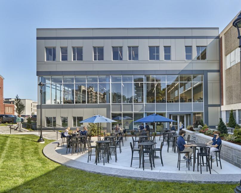 The Center includes three STEM labs, a maker space, multiple science labs, and an open, first-floor learning commons/gathering space for all students. It also houses a guidance suite with a college preparatory program that helps students apply for college and an enlarged computer lab for project-based learning. The siting of the Center also shapes a new outdoor green space and seating area for al fresco study breaks.