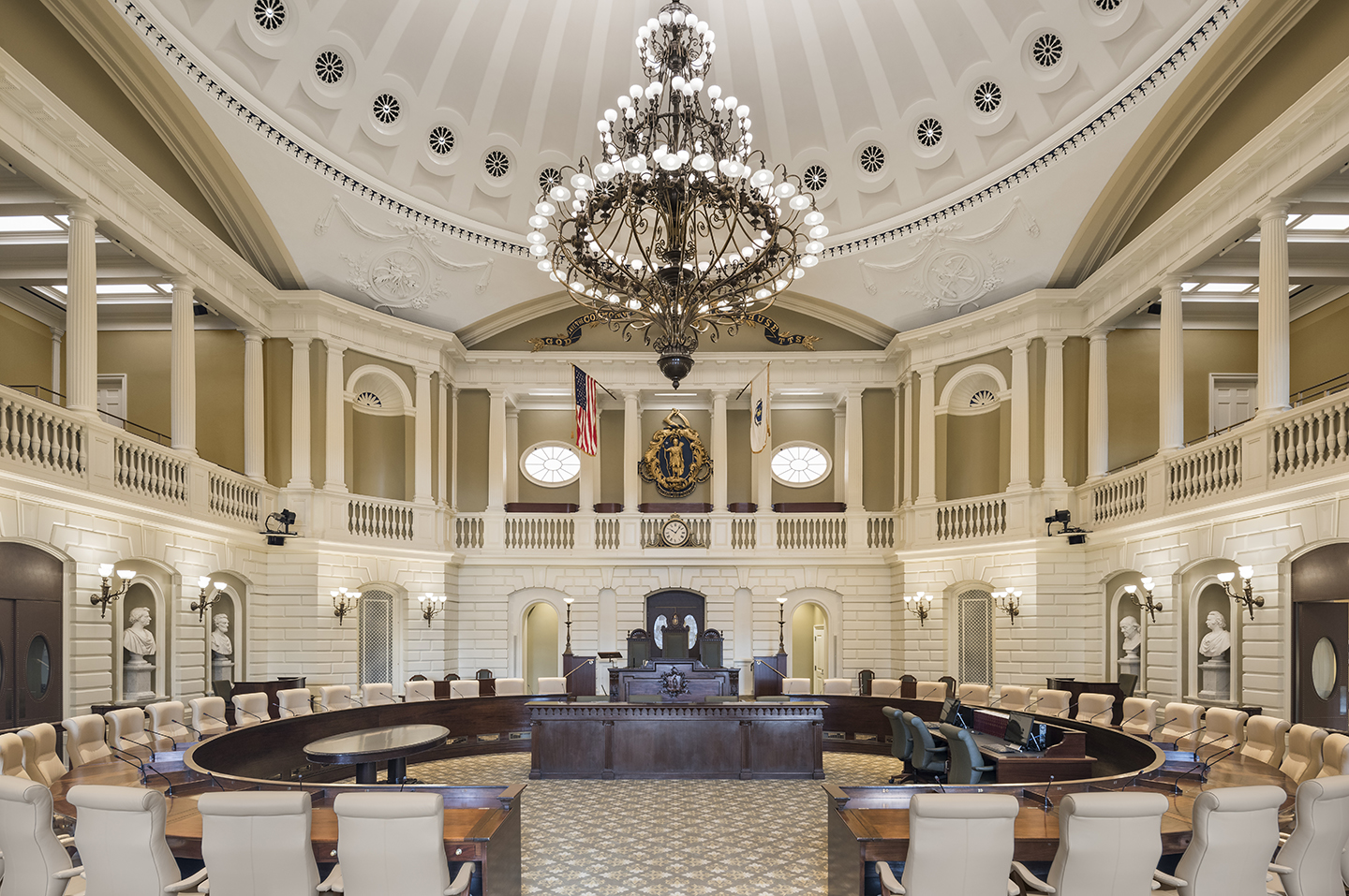 The historic Senate Chamber, located beneath the golden dome of the Massachusetts State House, had not seen a major renovation in 120 years. Originally designed by Charles Bulfinch in 1795 for the House of Representatives, the Chamber had undergone repeated alterations, often within the context of larger State House expansion projects. Many alterations were respectful of the original design, and few attempted to completely transform the look of the room, however over time, wear, layers of maintenance, and outdated infrastructure took a cumulative toll on the condition of the Chamber. Following extensive historical research and design study, the Chamber was renovated in 2018 to meet 21st century needs, while remaining faithful to its architectural history and returning the room to its historic colors of 1898, when it first became the meeting place of the Senate.