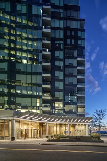 Amenities include a canopied entry/porte-cochere, concierge service, and both social and wellness facilities. The ground floor provides a sweeping glass façade overlooking a manicured waterfront park and it is the home of two chef-inspired restaurants. There are three stories of below-grade private parking connected at each level to adjacent commercial parking to allow ample space for visitors.