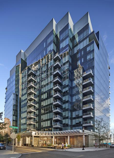 The design of this 118-unit residential building has a unique faceted design that takes maximum advantage of the buildings unique site. Units range from studio pied-à-terres to 3+ bedroom penthouse level units. Residents enjoy a library, private dining, and a luxury fitness spa. There are a broad expanse of windows in every unit, higher ceilings than any comparable current project, and a variety of private terraces and balconies. The building has a unique all-glass facade that maximizes views for residents from the inside out, and from the exterior will distinguish the building, symbolizing the crystalline waterfront setting.