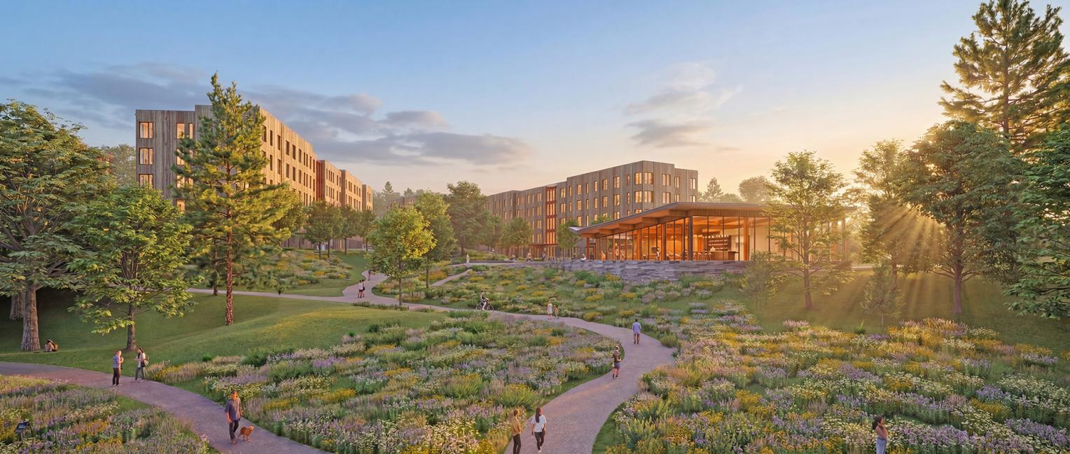 The buildings are all connected by a network of accessible paths and a central accessible multi-use trail that links to the wider network of hiking and biking trails in the area. Students will be able to relax, study, or gather in the open air close to each building, or walk to the Community Center, where a large outdoor terrace with fireplace, movable furniture, and attractive lighting will ensure that there is always something going on throughout the day and throughout the year.