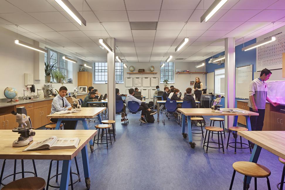 Designed over two floors, the new 11,000-square-foot Science Wing incorporates the extensive interior renovation of the existing science wing located within Lane Hall and repurposed space beneath  the Elfers Center for the Performing Arts. The Wing features a new open common student and teacher demonstration space created by the reconfiguration of existing classrooms and includes new locker rooms and toilets. This transformation changed enclosed corridors into a visually connected area for student learning and group work.