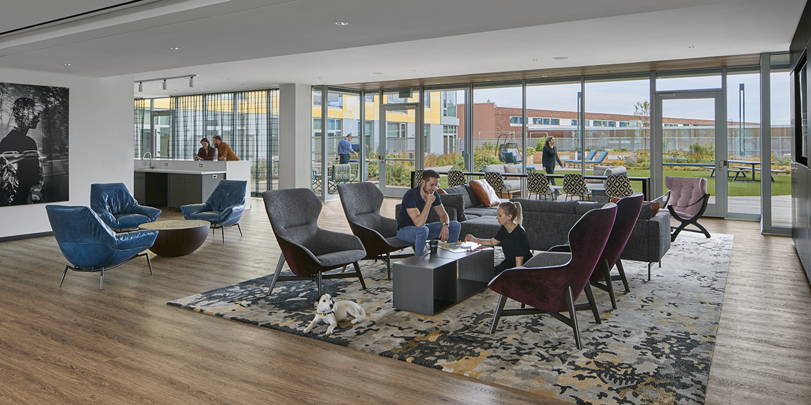 Amenity spaces include a light-filled media lounge with work and social touchdown spaces; a generous outdoor terrace equipped with grills, outdoor recreation and whimsical furniture, and rooftop gardening for the residential community. CBT was both the base building architect and the designer of interior spaces.